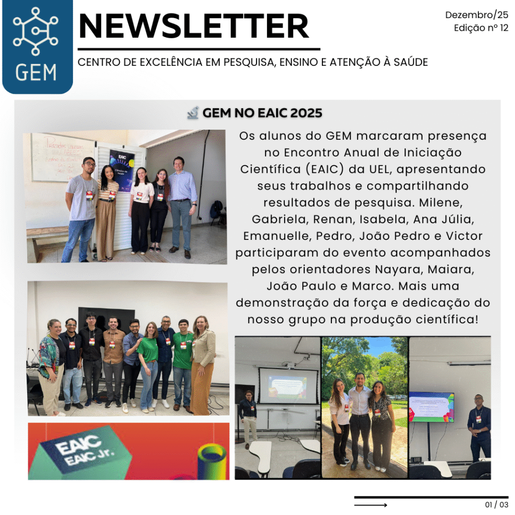 Os alunos do GEM marcaram presença no Encontro Anual de Iniciação Científica (EAIC) da UEL, apresentando seus trabalhos e compartilhando resultados relevantes em suas áreas de estudo. Milene, Gabriela, Renan, Isabela, Ana Júlia, Emanuelle, Pedro, João Pedro e Victor estiveram no evento, acompanhados pelos orientadores Nayara, Maiara, João Paulo e Marco.